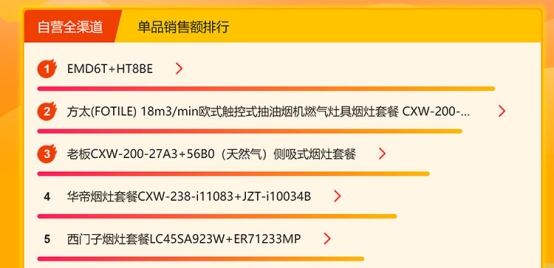 在单品销售额排行方面,来自方太的两款烟灶套餐拿下了第一名和第二名,拥有油烟不倒灌,劲吸速排易拆洗的油烟机,以及一级能效款的燃气灶,成为用户下厨好帮手。我们还可看到,老板、华帝和西门子的烟灶套餐分别占据第三到第五位,表现同样不错。
