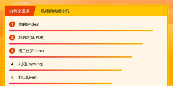 最后我们再来看下创意厨电(涵盖微波炉、光波炉和电磁炉等产品,日常生活中同样非常重要)的品牌排行:美的力压苏泊尔和格兰仕拿下第一,九阳和利仁位居第四第五,激烈的品牌攻防大战仍在继续。