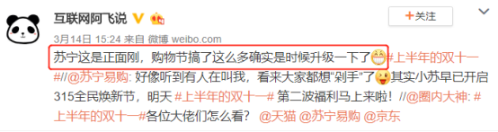 随着315晚会的临近,315的气氛也越来越浓烈,而近日微博上传得火热的“将315打造成为‘上半年的双十一’”事件,似乎也有了一个令人满意的结果……