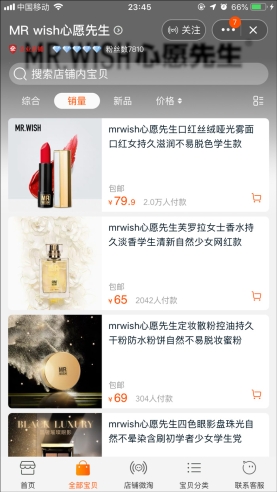 从“心愿先生”的网上商店中,小编发现一款口红的月销量就超过了2万人付款,远远高于其它MR.WISH的单品销量。如果按照其公布的79.9元的价格,该单个商品的销售金额就接近160万元了,再加上线下“幸运盒子”实现的销量,此单品的总销售量蔚为可观。如此高频的单品销量,很像电商行业的“爆款销售”策略。