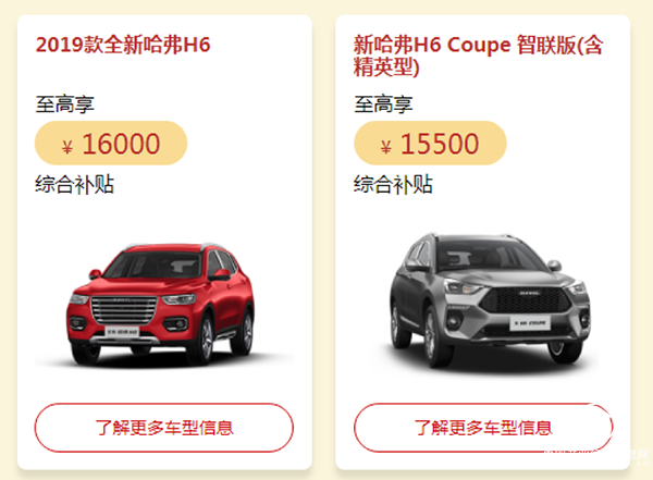 目前,长城汽车哈弗H6为庆祝哈弗全球销量超过500万辆,诚意推出现金礼+置换礼和金融贴息优惠政策,全系车型均可享受最高可达2.8万元的下乡补贴。其中,哈弗热销车型新哈弗H6Coupe、2019款全新哈弗H6可享受额度高达1.5万至2万元的综合补贴。相信长城随着优惠政策的开展,长城汽车哈弗全系必将再迎热销之势,再造长城汽车新名片,让我们拭目以待。