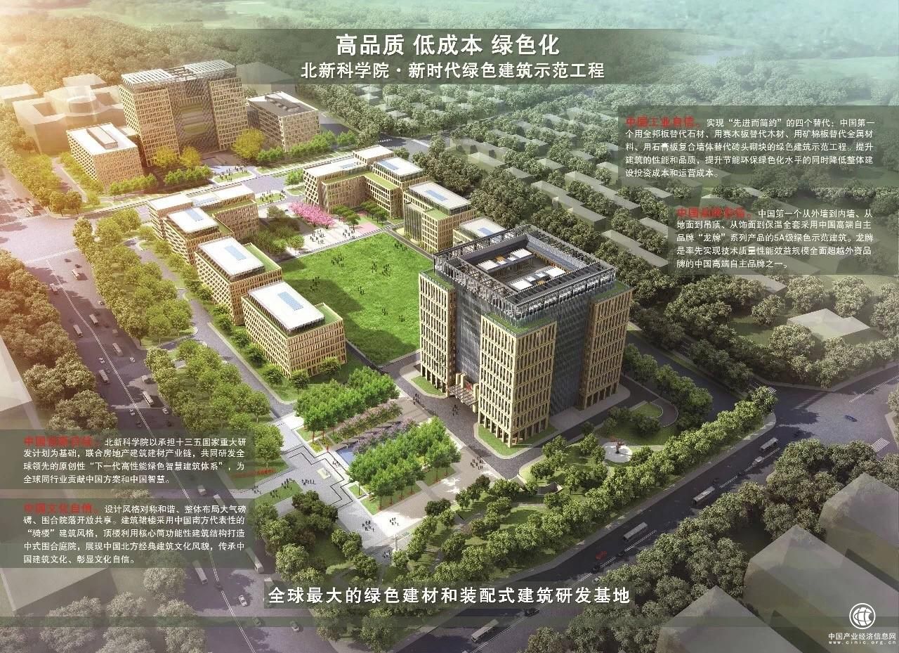 北新建材在北京未来科学城研发总部的中国绿色建筑示范工程于2017年10月25日竣工,10月27日搬迁入住,整栋建筑实现了用金邦板替代石材、鲁班万能板替代木材、石膏板复合墙体替代砖头砌块、矿棉板替代金属板、弹性地板替代瓷砖地毯木地板的全绿色产品、全装配化施工、符合绿色三星标准,真正实现“即装即住”的全球第一幢新时代绿色示范工程。作为全球最大的绿色新型建材和装配式建筑研发基地,北新建材积极践行绿色低碳发展、创新发展及高质量发展的理念,全力打造“全产业链全生命周期的绿色化”,通过迭代创新和全球原创,从原材料上减少自然资源开采和消耗,全面替代传统施工方法和建筑材料,全面取消砖头石材、壁纸壁布、油漆涂料等湿法作业,实现100%全干法装配式技术体系;实现个性化设计、工厂化生产、装配化施工,不用晾味、即装即住。