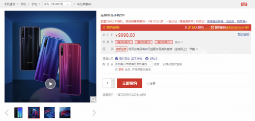 今日(4月10日),有网友发现,荣耀20i已经在VMALL商城、京东和天猫开启了预约页面。值得注意的是,不知道是荣耀工作人员操作失误,还是有意为之,在这些已经意外放出的预约页面上,我们可以看到荣耀20i的不同颜色的外观都已经提前揭晓,一些重要的配置也被泄露。