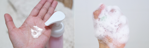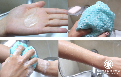 产品的质地是这种凝胶质地的,不会像那种乳液式的沐浴露意义感觉太稀,放在手掌上揉搓,涂抹感受非常温和的,如果使用沐浴球或浴巾的话,泡沫就会瞬间增加!