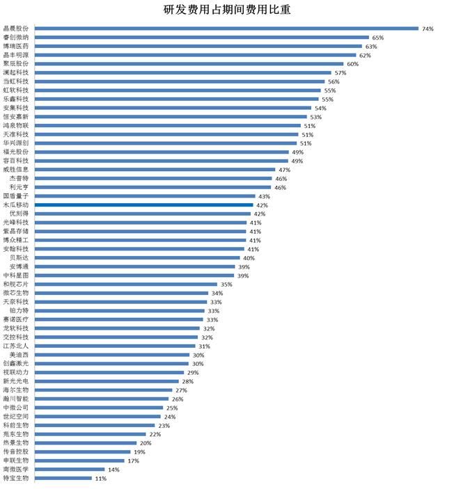 综合上面三个指标的分析,可以看到很多的企业在这三个排名里面是比较一致的,所以对这些企业来说,研发占营收比应该是一个比较准确反映研发投入的指标。但是有些企业这三个指标就相差很大。比如,研发占营收比排第二名的(29%)微芯生物,研发占毛利比排名第14位(30%),而研发占期间费用比不如大多数其他的企业,排名第31位(34%)。这种情况下,很难下结论说,微芯生物是所有被受理五十家企业中研发投入力度最大的几个企业之一。