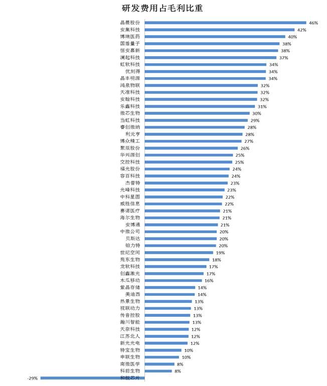 除了研发占营收比这个指标之外,还有两个不能忽略的指标,研发占毛利比和研发占报告期费用比。通过研发占毛利比这个指标可以看出这个企业拿多少赚的钱投入到研发中;而很显然,研发占报告期费用比,如果一个企业在所有的管理、销售、财务、和研发费用中研发占比高,直接就能说明这个企业对研发投入的程度。