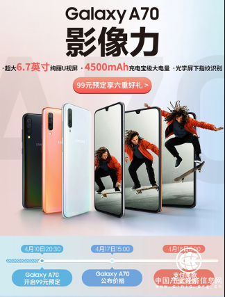 近些年,三星电子通过GalaxyA系列持续拉近与年轻消费者的距离,为年轻人带来更符合他们品味的产品。随着全新的GalaxyA系列的推出,三星电子再次让消费者领略到了技术创新所带来的魅力。此次三星GalaxyA70正是凭借着领先的全面屏设计和出众的拍照创新,为年轻消费者带来了全新的影像体验。目前,三星GalaxyA70已经开启预约活动,消费者可在三星网上商城、苏宁易购、苏宁易购天猫旗舰店以及苏宁线下活动门店参与99元起的定金预约活动。凡成功预约的用户,除可以更早体验到这款绚丽U视屏的GalaxyA70外,还将有机会获得多重惊喜好礼。