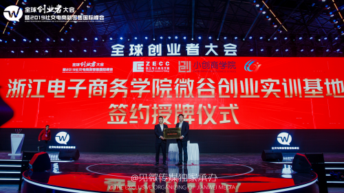 浙江电子商务学院是义乌市政府与浙江商业职业技术学院为打造互联网人才而合作共建的学校,此次与培养社交新零售人才具有丰富实操经验的微谷控股,专注大学生创业的资源共享平台-启迪创梦牵手合作共建浙江电子商务学院微谷创业实训基地。并在全球创业者大会暨2019年社交电商新零售国际峰会中举行了授牌签约仪式,浙江电子商务学院副院长何伏林,微谷控股联合创始人徐东遥,启迪创梦董事长张青进行了合作签约。基地负责人吴道军接受了学院的授牌。