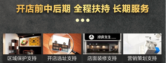 选址评估服务,“凉皮先生”总部全力协助选址,以确切数据考察评估,进而选定开店位置;店面装修,“凉皮先生”统一的店面形象,大力提升店面格调;培训操作,“凉皮先生”总部技术运营、实体店培训悉数到位;开业带店,开店没经验?“凉皮先生”总部施行一对一帮扶,详解开业准备事宜;进入运营阶段,“凉皮先生”总部人员的驻店支持,将协助新店快速上轨;营销支持,节假日活动策划,时时刺激消费;技术支持,新产品免费提供上线;物流配送,在线订购平台,物流高效配送。如此一来,“凉皮先生”总部实现了对加盟商全方位的扶植,全力保障了加盟商的利益与可持续发展。