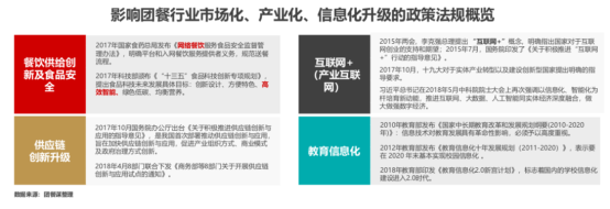《报告》认为,涉及教育信息化、食品供给侧、互联网+等多个领域的一系列政策法规交叉协同,成为推动团餐行业信息化进程的重要契机和催化剂。