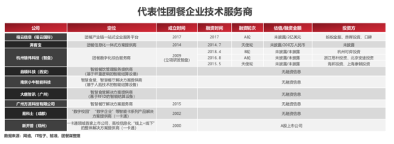 对比社餐,团餐的信息化程度低,发展不均衡,加之行业传统、业态复杂、进入壁垒高,目前市场上专业的团餐信息化服务企业只有少数“吃螃蟹”者,大致分为三类: