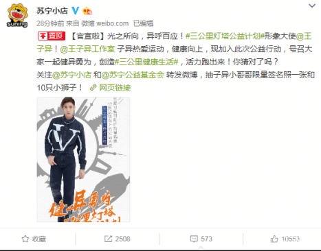 活动倒计时2天,苏宁小店还向外界公布“三公里灯塔公益计划”的形象大使,正是当红小生王子异,其健康阳光的形象也是完美符合苏宁小店举行此次活力跑活动的初衷,并将号召到更多年轻人群,加入“三公里健康生活”。