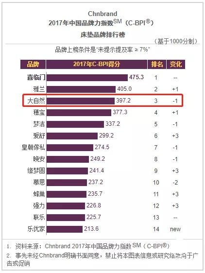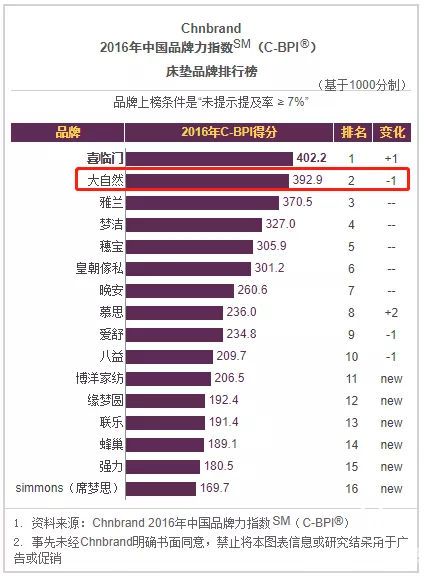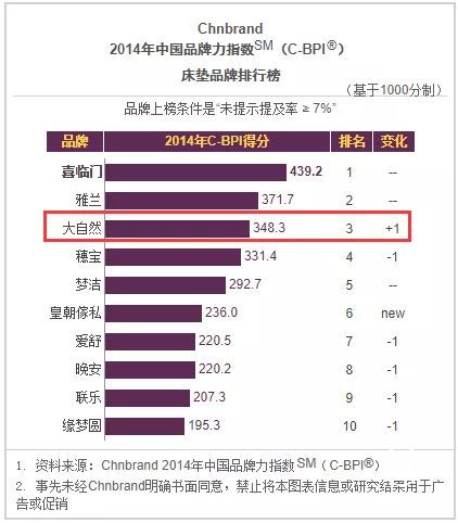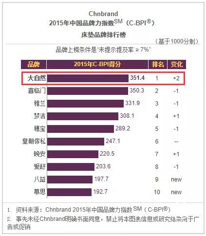 此次,荣登C-BPI中国床垫行业品牌榜第二,是消费者对大自然床垫的肯定和鼓励,更是大自然前进的动力与责任。