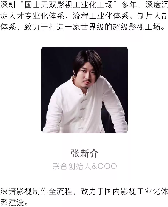 作为一家以“国视无双”为使命的企业,国士无双影视工场致力于要打造一家世界级的超级影视工场,定位“国士无双影视工业化工场”模式,深耕影视工业化,专注专业化、流程化,艺术化、规模化,剑指主旋律影视,讲好中国故事。公司深耕上游IP孵化、中游影视全流程制作、下游宣发和衍生,深度布局影视工场全产业链。