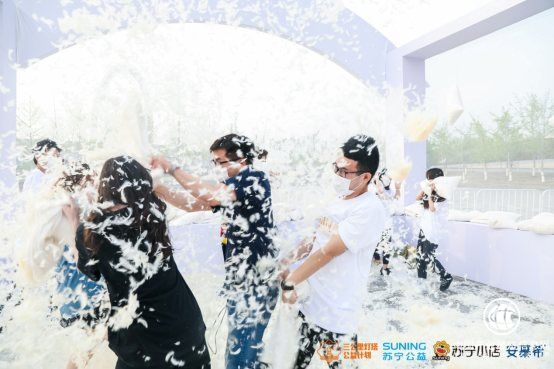 更有趣的是,苏宁小店“活力跑”还有许多以往跑步活动难以见到的有趣玩法:看看那些画风各异的DIY涂鸦,是不是感觉自己置身于某种艺术活动?看着用户在解压泡泡墙旁边按压气泡来放松,你能想到这是跑步活动?而那些刚冲过终点的跑者们竟不是选择找个地方休息,反而玩起了枕头大战,是不是让你感觉这是亲朋好友之间的嬉戏了?