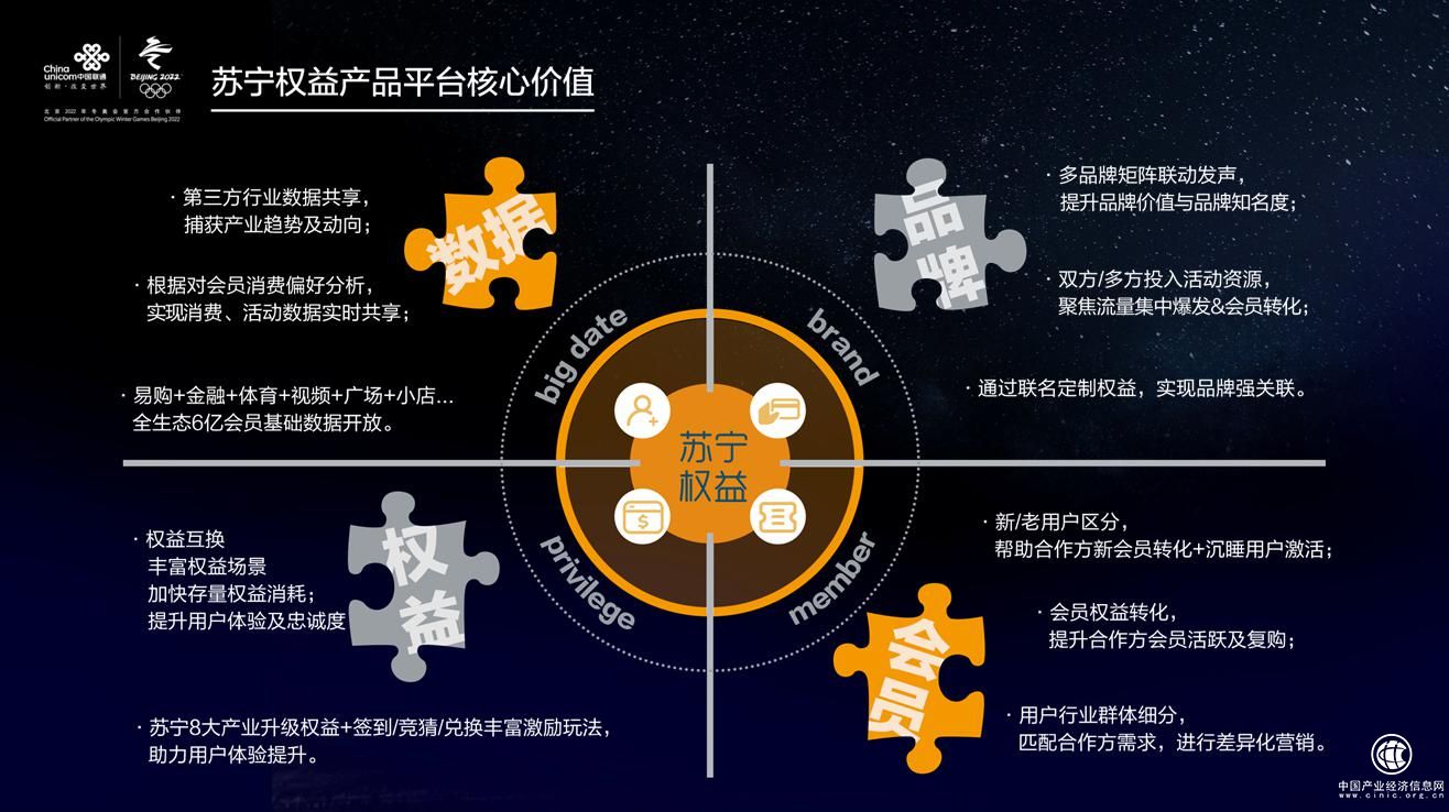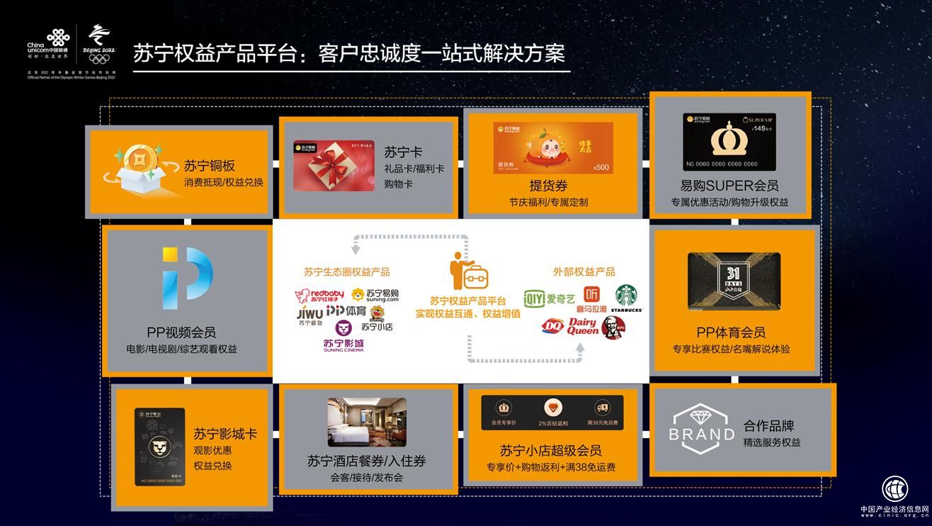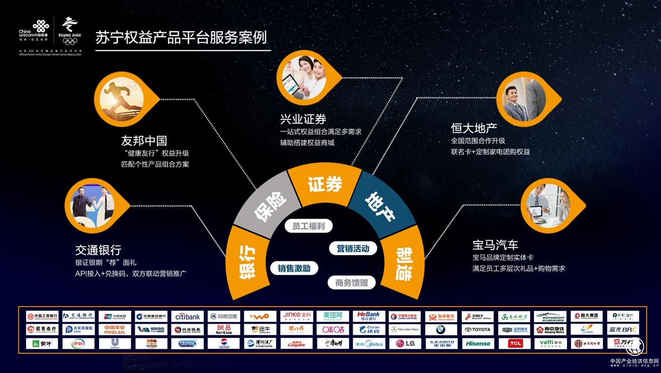 苏宁权益产品平台凭借苏宁线上线下O2O智慧零售生态布局,持续强化技术业务的协同发展,为运营商、互联网、金融、地产、交通、医药、快消、制造业等多个行业及品牌提供整套权益解决方案。已与中国联通、中国移动、中国电信等运营商,太平洋保险、友邦中国、交通银行、招商银行、中国银联、兴业证券、中投证券等金融机构,恒大、蓝光、碧桂园、金科、龙湖等地产商;蒙牛、伊利、农夫山泉、雀巢、杜蕾斯等快消品牌,美的、海信、创维、宝马、丰田、奔驰等制造商500强企业深度融合、专属定制,实现权益方案整体输出与智慧零售生态全面共享。