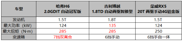 与全新哈弗H6相比,同为1.5T发动机的荣威RX5在最大扭矩上略逊一筹。虽然吉利博越在最大功率和最大扭矩方面占优,但是它配置的是1.8T的发动机,数据略高也是正常现象。而在变速箱使用方面,吉利博越搭载的是6档手自一体变速箱,荣威RX5则是6挡手动变速箱,这都比不上搭载了有着“世界十佳变速器”称号的7DCT的全新哈弗H6。所以整体而言,这两款车在动力系统上都不及全新哈弗H6。