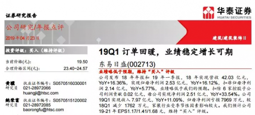 预计 19-21 年 EPS 1.17/1.41/1.68 元(前值 19/20 年 EPS 原预测值为 1.29/1.59 元), 调整主要系此前收入预测基数偏高。参考 19 年可比公司平均 19.80X 的 PE 估值水平,考虑到公司 19Q1 订单回暖明显,未来业绩稳定增长可期,同时速美业务提升空间大,我们认可给予公司 19 年20X-21X PE,对应合理价格区间 23.40-24.57 元,维持“买入”评级。