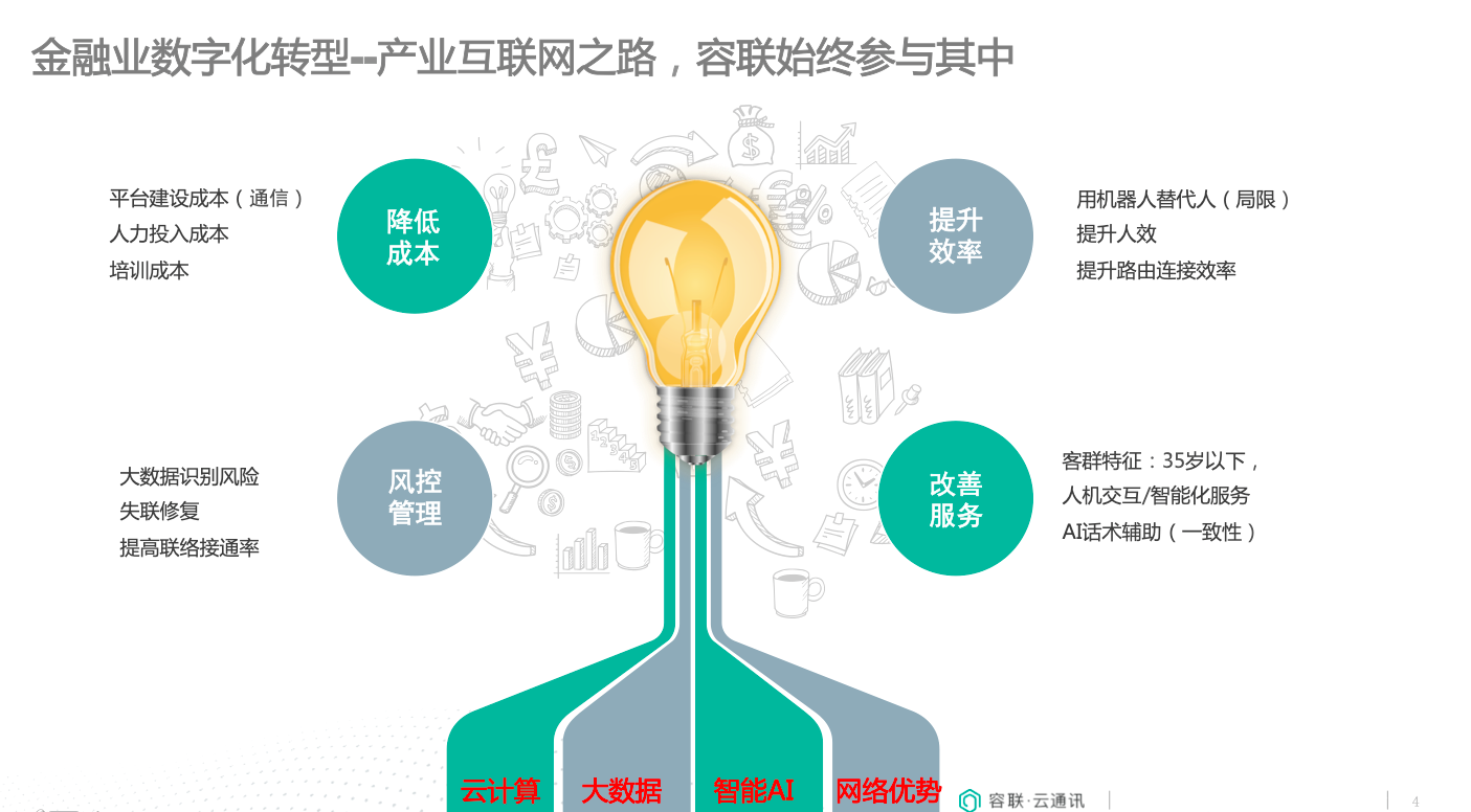 当前,智能移动设备、大数据和分析、云计算等迅速崛起开辟了金融科技发展的新路径,"数据化+智能化+云化+场景化"成为金融企业转型发展的主旋律,容联通过整合包括升级换代、运行维护、系统集成、产品选择、电信资源、网络、计算资源、基础设施等客户关心的业务发展、运营管理、系统使用等方面,为客户提供一站式解决方案,让客户关注他们擅长的,让企业更专注自身业务发展。