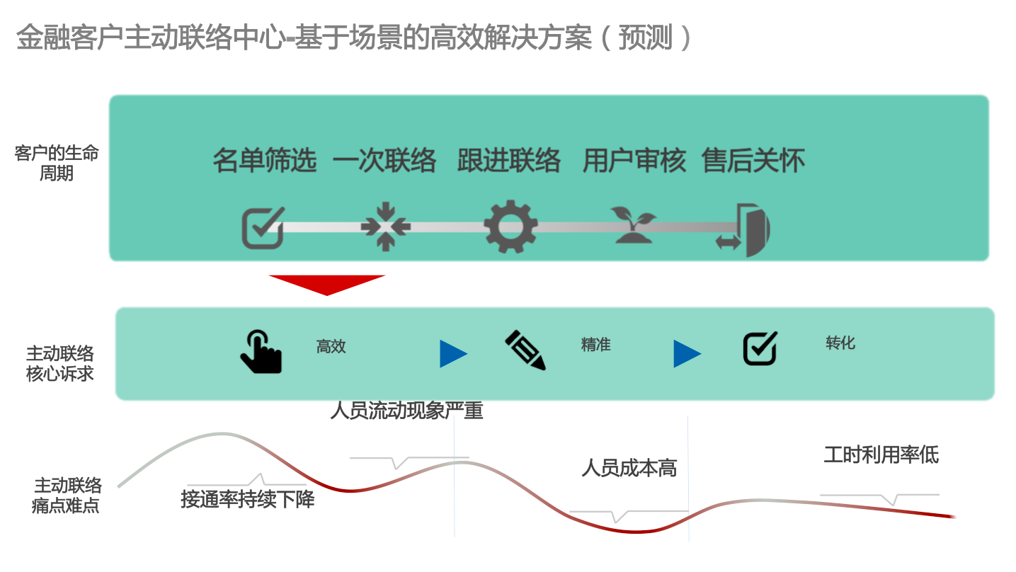 金融企业数字化转型的核心竞争力是能否提供无缝、流畅的客户体验。容联金融客户主动联络中心正是一个基于场景高效的企业通讯解决方案。在客户的生命周期里,金融企业有大量跟客户主动联络的需求比如名单筛选、一次联络、用户审核、售后关怀等,但是也面临着接通率持续下降、人员流动现象严重、人员成本高、工时利用率低等痛点。