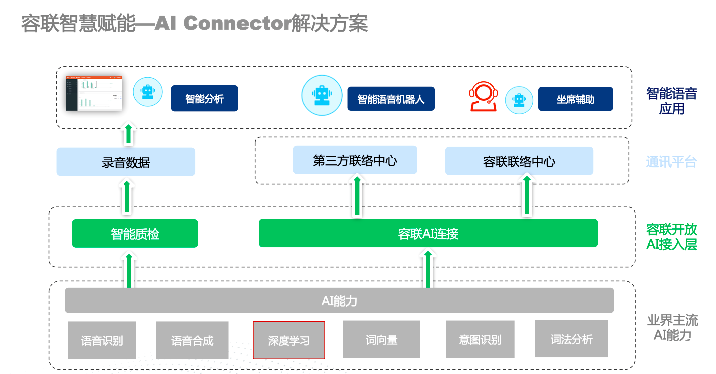 首先,容联AI Connector通过容联AI连接可以帮助金融企业在不影响原有生产系统的情况下快速对接包括语音识别、语音合成、深度学习、词向量、意图识别、词法分析等业界主流的AI能力,并且帮助企业快速生产业务模型,积累沉淀有价值的交互数据。