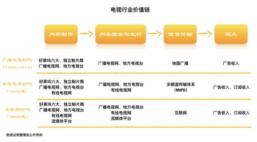 如图,传媒行业至今经历了三个时代,但不管时代如何变化,价值链中始终存在三大角色,即内容制作方、内容整合与发行方、信号传输方,其中制作和发行方数十年来一直不断争夺着行业的主导权。