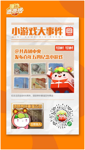 在小游戏的互动中, 一代又一代的五四之风得以彰显与传承。玩家在团宝(共青团中央新媒体IP)的引领下,一路搭木板、过障碍,沿着百年历史长河,穿越“重回1919”、“红船起航”、“开天辟地”、“春天的故事”、“建功新时代”等结合重大历史事件或时期打造的十二个关卡,切身体会百年青运的历史意义。同时,每一关都埋下了不同时期代表青年的图鉴彩蛋,当玩家过关斩将获取了图鉴之后,也可以将图鉴中的知识分享给好友,让好友也加入到重温百年五四的行列中。