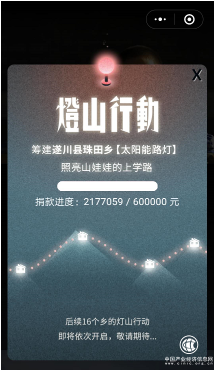 小游戏将公益性与游戏性结合,唤起玩家的公益心,同时也为社会公益事业提供新的传播形式,推动公益事业发展。截至目前,这个公益项目已筹到210多万,玩家游戏里的手电筒,成功换成遂川县珠田乡的路灯——遂川县珠田乡110套太阳能路灯也已全部完工,孩子们的上学路成功点亮。