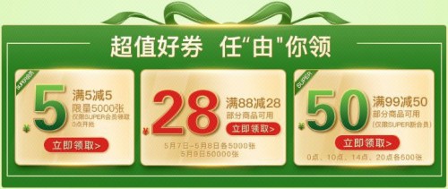 据了解,活动期间,消费者除了享受劲爆的爆款直降优惠外,还能领券享受折上折。如满88元减28元的满减券,super新会员还可领取满99元减50元的超值好券。