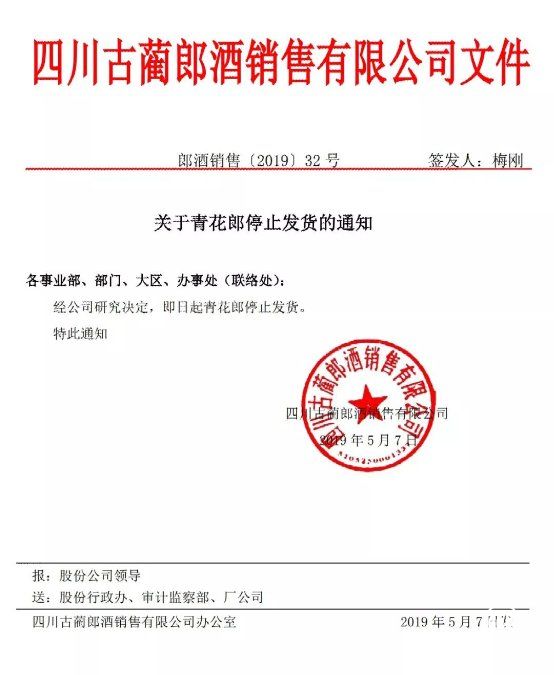 5月7日,郎酒销售公司发布通知:即日起青花郎停止发货。