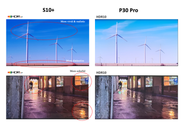 另一方面,三星Galaxy S10、S10+的屏幕分辨率为2K+,支持HDR10+显示技术、亮度800nit、0.4JNCD的色准,使其成为目前业内色准最高的屏幕。而华为P30 Pro仅支持HDR10显示,且同一测试环境下屏幕亮度也仅为617 nit。但早在4年前,三星Galaxy S6就已支持600nit的屏幕亮度,此次的S10+更比上一代S9+的700nit还提升了14%,三星创新升级的实力可谓给足了用户惊喜。