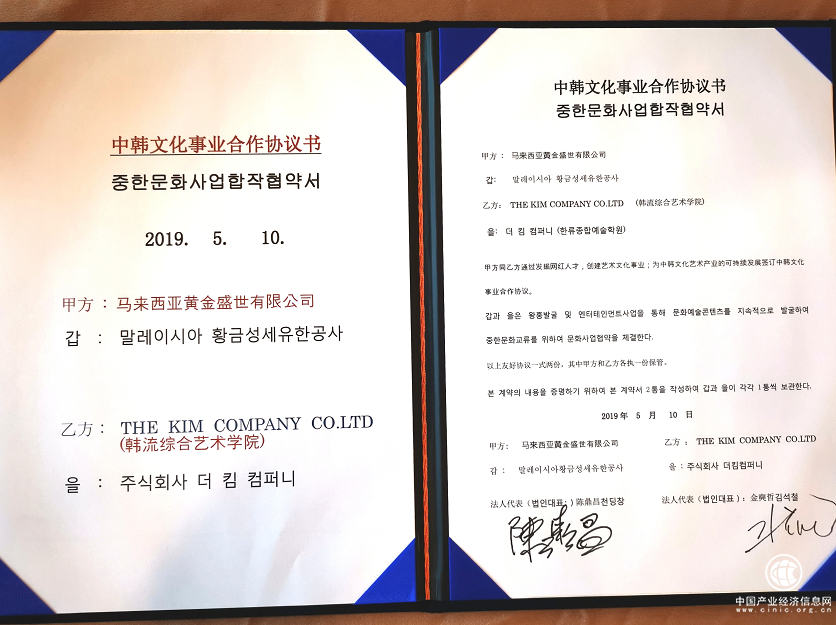 2019年5月10日,马来西亚黄金盛世集团与韩国THE KIM社团网红机构战略签约仪式在韩国首尔隆重举行。马来西亚黄金集团全球总裁斯蒂文、THE KIM社团代表金爽哲、榴莲微视海外事业部方相棋、张泽及多名网红代表出席了签约仪式。就发掘网红人才,网红主播的培养及输出,创建艺术文化事业,为中韩文化艺术产业持续发展,双方达成了战略合作共识,并签署了网红孵化培训合作协议。