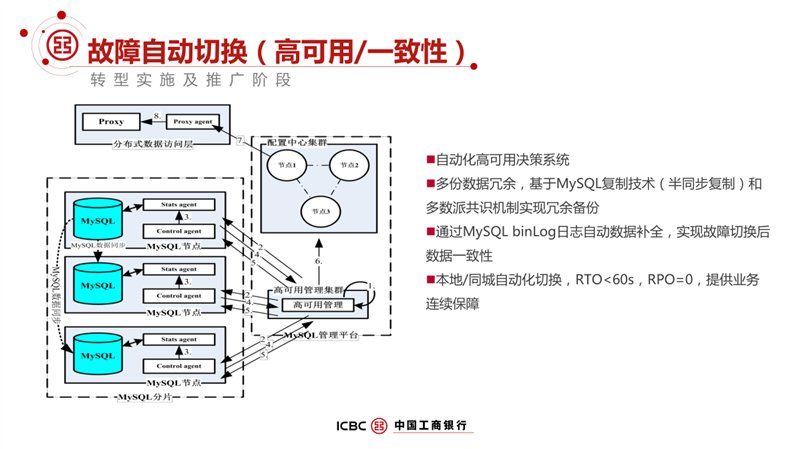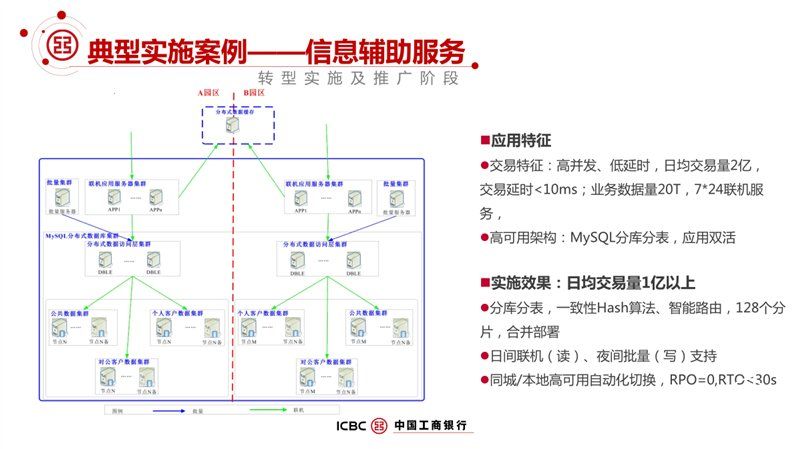 摘要:本文根据DTCC数据库大会分享内容整理而成,将介绍工商银行 IT 架构转型中传统 OLTP 数据库架构面临的挑战和诉求,构建基于 MySQL 分布式企业级解决方案实践历程,包括技术选择、高可用设计、两地三中心容灾、运维管理、资源使用效率等方面的思考和实践经验,同时也介绍了工行转型的成效以及对后续工作的一些思考。