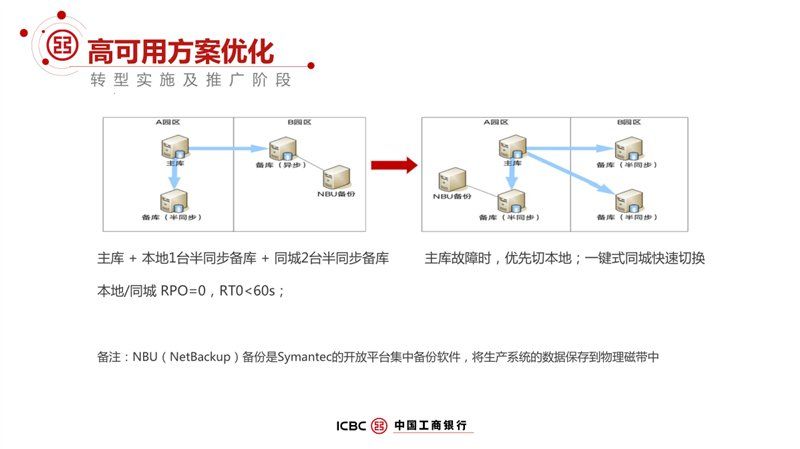 同时实施过程中我们走的比较快了,一年几百个节点,几十个应用。在这个过程中,我们又对高可用方案进行了持续的优化,同时学习和借鉴互联网包括分布式数据库的一些方案,我们把一主两备,本地1备和同城1备,扩展成1主3备,通过半同步的机制,做到真正的在系统级去保证RPO=0;