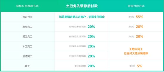 土巴兔的“先装修后付款”模式,完全不同于行业内部分企业推出的所谓的“先装修后付款”业务。有些企业以“先装修后付款”为噱头吸引消费者上门,但消费者最终发现合同约定的付款模式才做完第一阶段就付了大部分款项或者开工就需要支付一笔不小的款项。