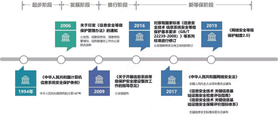1994年,《中华人民共和国计算机信息系统安全保护条例》(国务院147号令)规定,“计算机信息系统实行安全等级保护,安全等级的划分标准和安全等级保护的具体办法,由公安部会同有关部门制定”,等级保护制度正式被提出。