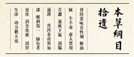 早在明清时期,普洱茶的健康价值就被发现了,关于普洱茶的健康价值在一些文献典籍中均有记载。明末,学者方以智已在其《物理小识》中明确写道:“普洱茶蒸之成团,西藩市之。最能化物,与六安同”。清代著名医学家赵学敏编著的《本草纲目拾遗》成书刊印,他在著作中从药性的观点说普洱茶“味苦性刻,解油腻牛羊毒”、“苦涩,逐痰下气,刮肠通泄”、“消食化痰。清胃生津,功力尤大”。