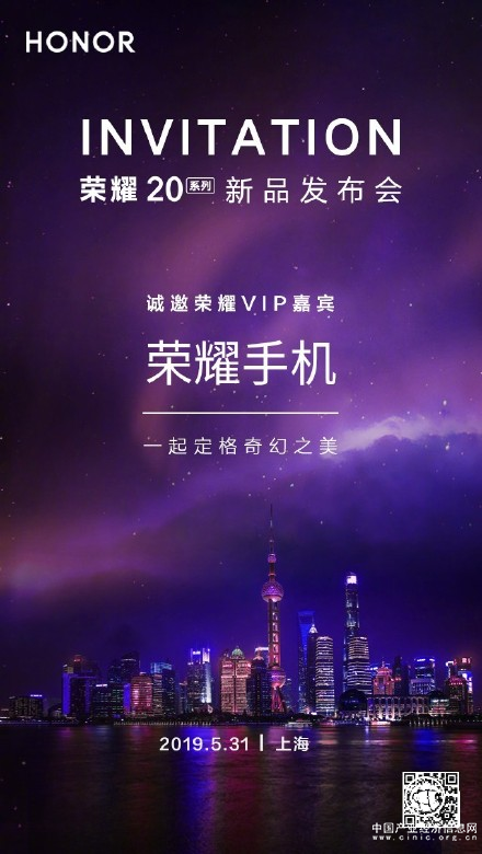 从邀请函中,我们了解到荣耀20系列国内发布会在5月31日下午6点,上海东方体育馆。