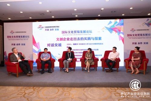 最后,中央财经大学文化与传媒学院魏鹏举院长主持了以“文创企业走出去的实践与探索”为题的对话交流,北京洪泰文旅科技股份有限公司胡敏总裁、四达时代集团赵月琴副总裁、华韵尚德国际文化传播有限公司程冉副总经理、北京文投国际控股有限公司陈刚副总经理、澳星国际传媒集团葛宏宇副总裁等嘉宾进行了热烈又有深度的探讨,分享企业海外发展的宝贵经验,交流中国文化“走出去”的实践,寻求文化贸易方面的深层次、多领域合作,探索更好地推动对外文化贸易发展。