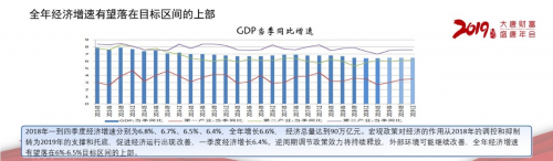 2018年一到四季度经济增速分别为6.8%、6.7%、6.5%、6.4%,全年增长6.6%,经济总量达到90万亿元。宏观政策对经济的作用从2018年的调控和抑制转为2019年的支撑和托底,促进经济运行出现改善,一季度经济增长6.4%。逆周期调节政策效力将持续释放,外部环境可能继续改善,全年经济增速有望落在6%-6.5%目标区间的上部。