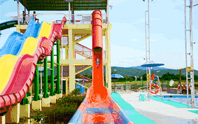 拥有全国首个大回环太空盘,是一个大回环滑梯与太空盘的完美结合项目。整个项目采用半透明玻璃钢材料,游客置身于紧闭的发射舱内,随着3·2·1的倒数,脚底踏板打开,从19米高的平台上通过水的润滑作用,身体如同坐过山车般,沿着几近垂直的滑管高速滑行。另外,还配有彩虹滑梯、亲子滑梯、趣味大翻桶、风水轮、旋转托盘等经典水上设备。