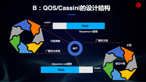 演讲时,周博士以QOS公链为例,QOS的目标是打造“下一代企业级应用的公链”。因此,从技术架构上,QOS采用的是底层公链+联盟链的双层链架构,主链和业务链之间采用Cassini中继,这样在跨链过程中可以不依赖可信的第三方帮助其进行交易验证,可以在拿到数据后自行验证,使得交易更灵活且快捷。此外,各业务链之间通过QCP的跨链协议,可实现业务链的异构并行,支持包括QOS原生业务链、Fabric、Ethereum等,以满足高性能的业务需求。