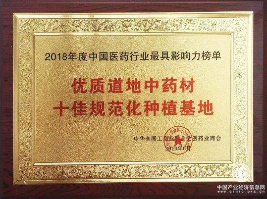 6月5日,在山东济南召开的2018年度中国医药行业最具影响力榜单发布会上,仲景宛西制药获得2018年度“中国优质道地中药材十佳规范化种植基地”荣誉称号。