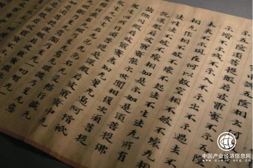 共21纸,共465行。此卷首脱尾全,有乌丝栏,全卷为原纸染潢,黄卷璀璨,楮墨精良。唐代重书学,特别在初唐、中唐、盛唐,写经的书法水平一般非常高。此经书法结体工整匀称,行笔遒劲舒展,丰腴秀丽,笔酣墨饱,带原杆,带经名,千年犹新,甚为难得。楷书用笔工整严谨,笔画挺拔端庄,行笔流丽,字体结构稳妥合理,卷首卷尾背面有“唐经上品”四字。著名敦煌写经藏家苏宗仁旧藏,8米余长,万不存一,为极为难得的千年书法墨迹,盛唐法宝,写经珍品。