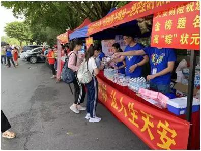 第一分队由综合部袁同荣经理带队,他们细心准备了医疗箱、风油精、矿泉水、环保袋等物品,搭建了遮阳棚,为高考生提供一片清凉之地,帮助他们保持最好的考试状态。 8点左右,十五中门口已经聚集了许多考生,员工代表嘱咐考生在遮阳棚下休息,为他们送上降温物品,并祝福他们“高考逢端午,必定高粽! ”