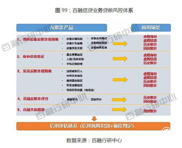 白皮书称,如果将具体的欺诈风险进行归类,可分为四大类:虚假身份、虚假信息、历史欺诈以及团伙欺诈。因此,在通过前端欺诈风险初筛时,针对这四种大风险板块,百融云创可从五个维度进行全方位判别:谛听设备反欺诈(分别从设备环境、应用偏好、行为画像、群体风险以及设备黑名单等方面进行单规则或群体规则的欺诈风险评判)、身份信息验证(主要从身份信息的一致性进行把关)、实名反欺诈(主要从实名信息对应的黑名单、中高风险历史行为记录等进行评估)、百融反欺诈评分(主要从综合的维度评判申请人未来欺诈的可能性)以及评判团伙欺诈的核心产品关系图谱。最后再流入综合信用风险判别。