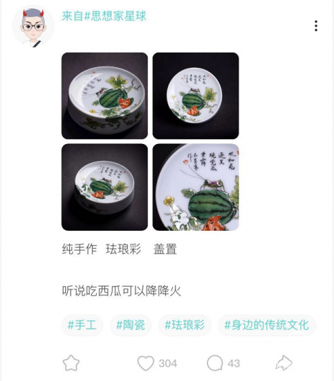 炎炎夏日,西瓜自然是消暑解乏的利器。以珐琅彩技术在陶瓷上印上西瓜,不仅外形美观艳丽,甚至能让使用者感受到清凉的气息。