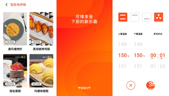 接入TOKIT APP后,TOKIT智能电烤箱还可以通过手机进行无线操控,远程即可调整加热区域、加热温度、加热时间等自定义设置。此外,TOKIT APP还提供了9种精选视频食谱,支持一键烹饪,无需担心烤焦或是不熟等因经验不足带来的烹饪困扰。而且,TOKIT APP主打的智能食谱视频还在不断地丰富中,无需为吃什么而烦恼。