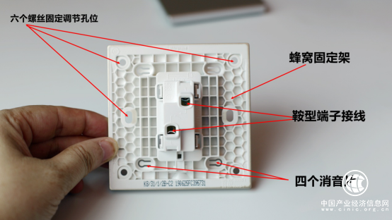 拆开背面,四角用四个螺丝固定孔,两边各一个螺丝调节孔,蜂窝固定架的加强筋也由两种结构组成:蜂窝和井字 ,这种设计增加成本,但是更抗墙面的压力,绝不会轻易变形。除常规的设计,还增加4个独有的消音片,保证睡眠安静。