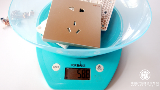 用料方面,去掉所有金属件之后,只称取塑胶件的重量,包括保护门,罗格朗逸景插座测试结果为58.8g 。